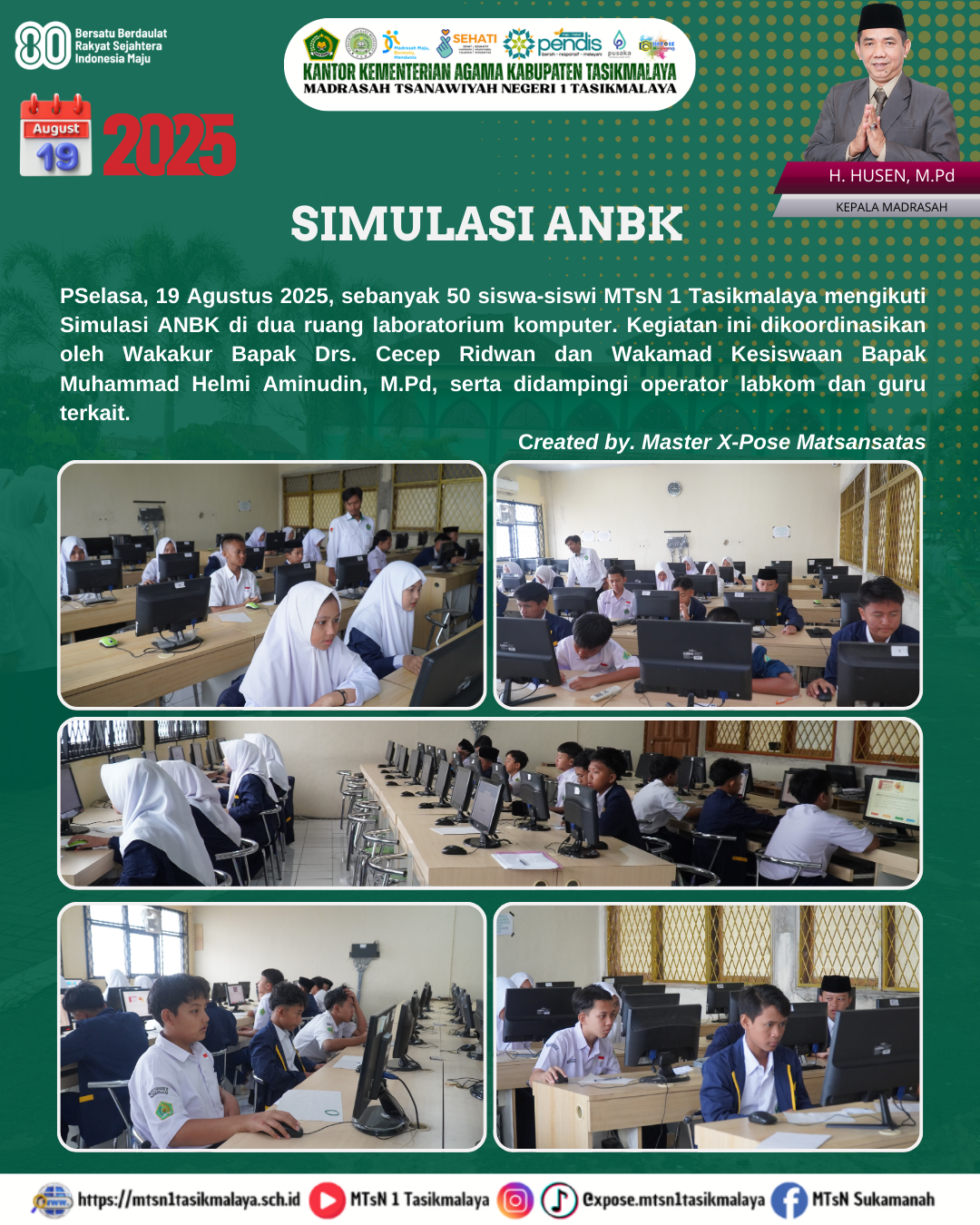 Pada hari Selasa, 19 Agustus 2025, sebanyak 50 siswa-siswi MTsN 1 Tasikmalaya mengikuti kegiatan Simulasi Asesmen Nasional Berbasis Komputer (ANBK). Kegiatan ini dilaksanakan di dua ruang laboratorium komputer madrasah dengan suasana tertib dan penuh semangat.
