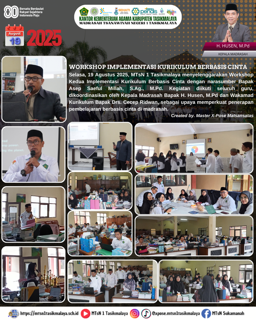 Pada hari Selasa, 19 Agustus 2025, MTsN 1 Tasikmalaya melaksanakan Workshop Kedua Implementasi Kurikulum Berbasis Cinta. Kegiatan ini diikuti oleh seluruh guru MTsN 1 Tasikmalaya sebagai peserta dengan penuh antusias.